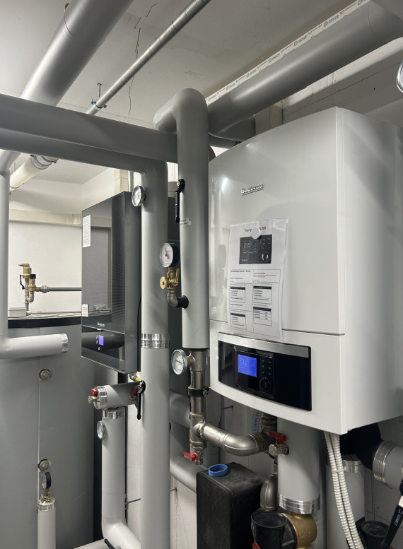 Als Wärmeerzeuger wird in dieser Hybridanlage eine Wärmepumpe in Kombination mit einer Gastherme verwendet